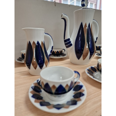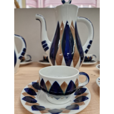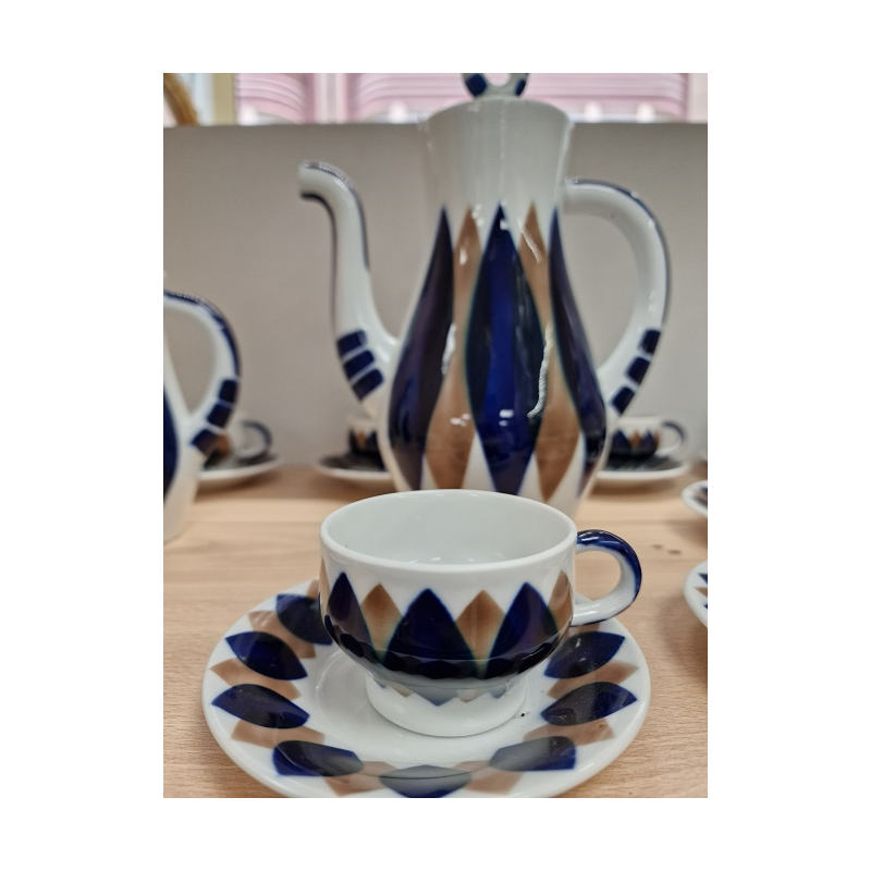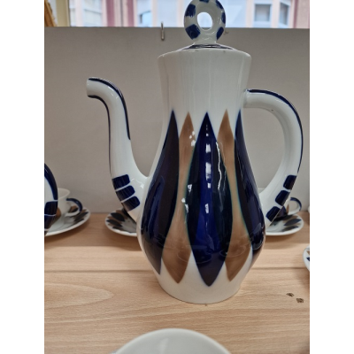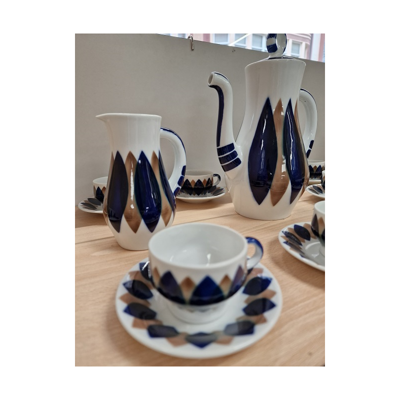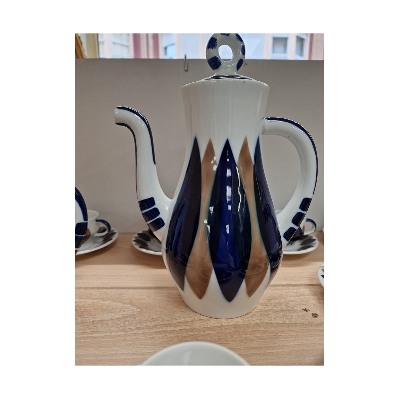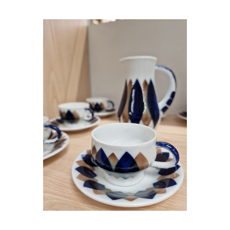Contiene 12 platos y tazas,una cafetera y una jarra de leche